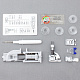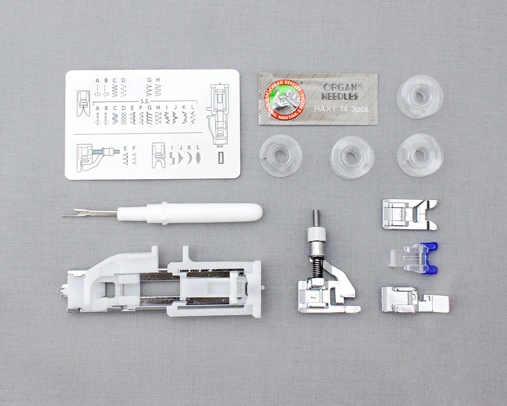 В комплекте Лапка стандартная Лапка для атласных строчек Лапка для вшивания молнии Лапка для невидимой подгибки Лапка для пришивания пуговиц Лапка для выметывания петли Распарыватель Набор игл Шпульки Пластиковая карточка с рекомендациями