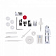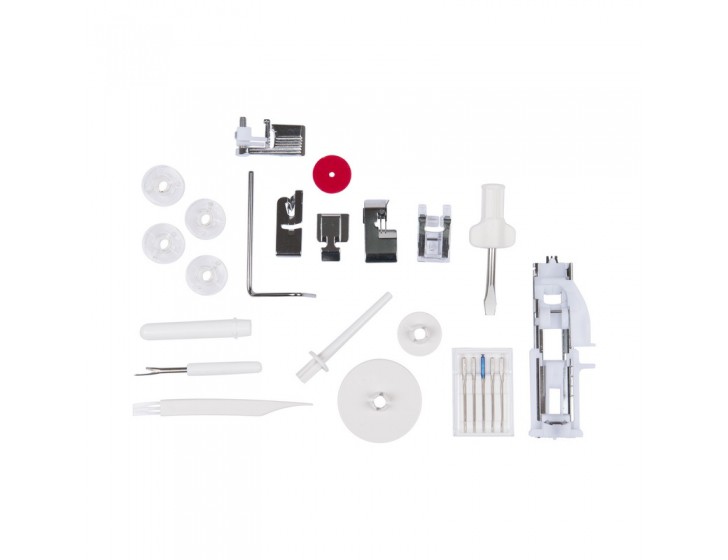 В комплекте Лапка универсальная, Лапка для вшивания молнии, Лапка для выметывания петли-автомат, Оверлочная лапка, Лапка для потайного шва,Лапка подрубочная, Лапка прозрачная для декоративных строчек, Направитель ткани, Набор шпулек (4 шт.), Набор игл, Вспарыватель, Большая отвёртка, Кисточка, Дополнительная стойка под катушку, Держатель для катушки (большой, маленький),Фетровая прокладка под катушку