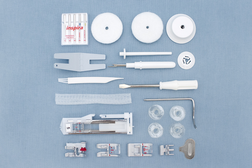 Клавиша шитья без педали поможет при создании длинных швов и изготовлении петель для пуговиц. Встроенный нитевдеватель облегчит заправку иглы и не даст вашим глазам постоянно напрягаться. Линейка на корпусе поможет делать необходимые замеры, не отрываясь от работы.